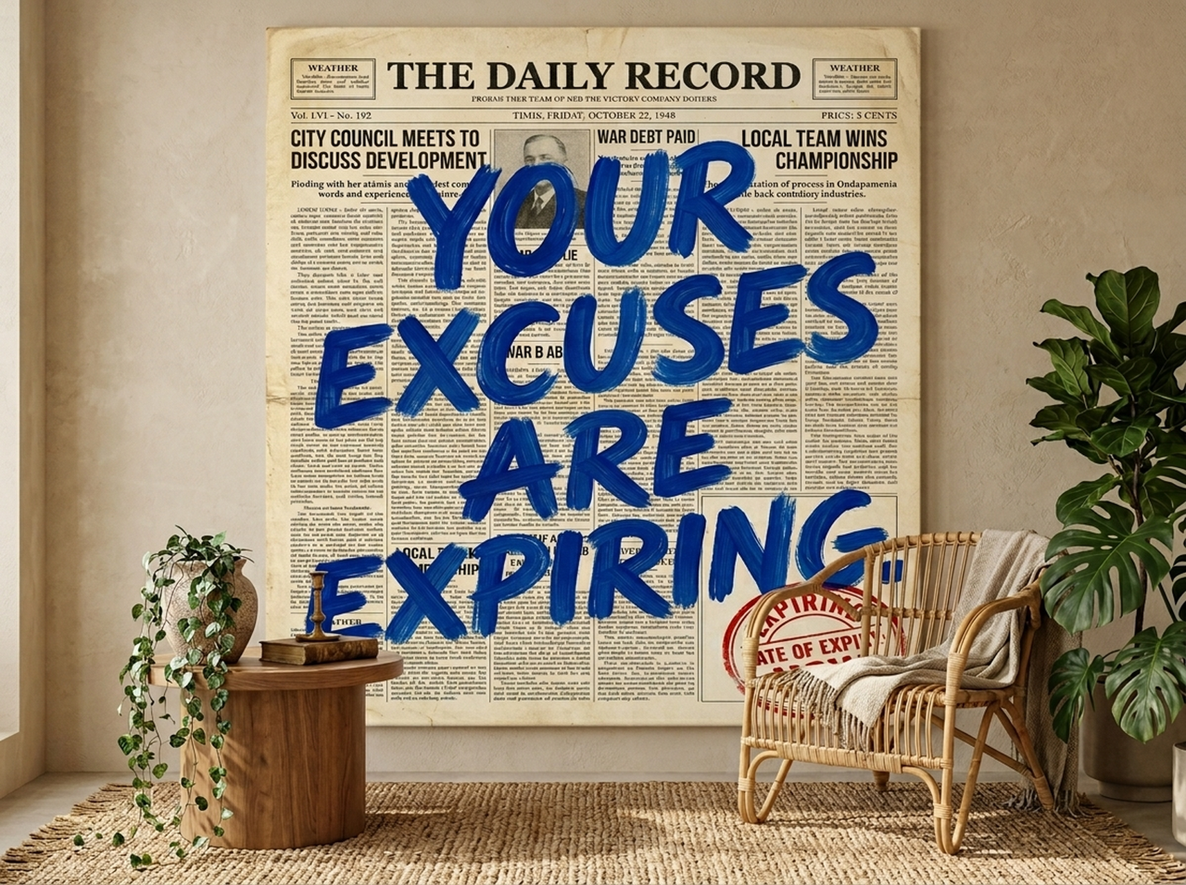 A fictional newspaper front page — THE DAILY RECORD — announcing the official expiration of excuses. Bold cobalt headline. Sepia newsprint texture. Columns of fine print detailing every excuse ever made and the date it officially stopped being valid. This is the funniest, most honest piece of motivational art you'll ever hang. And every single person who...