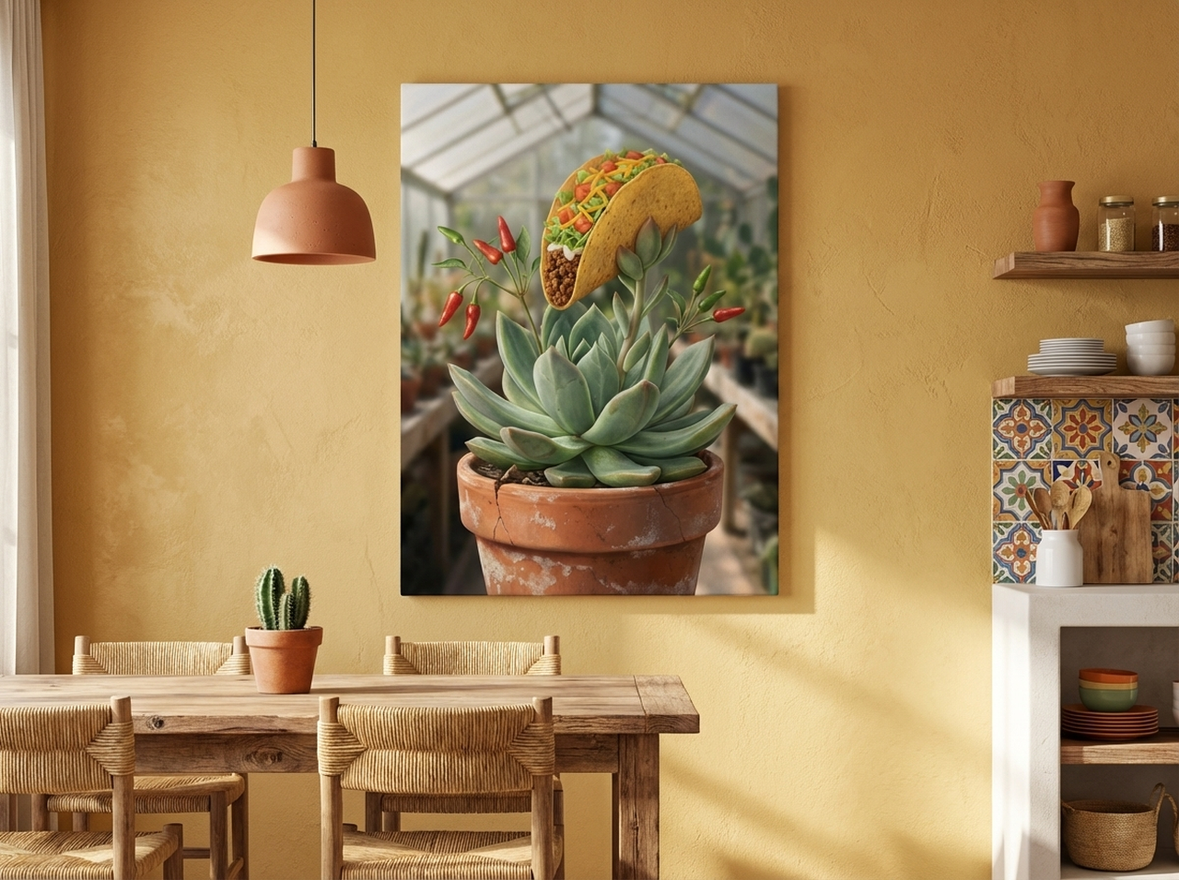 A taco sprouts from a succulent in a terracotta pot, surrounded by tiny chili peppers and greenhouse glass. This surreal kitchen print treats the taco as the rare botanical specimen it always deserved to be.